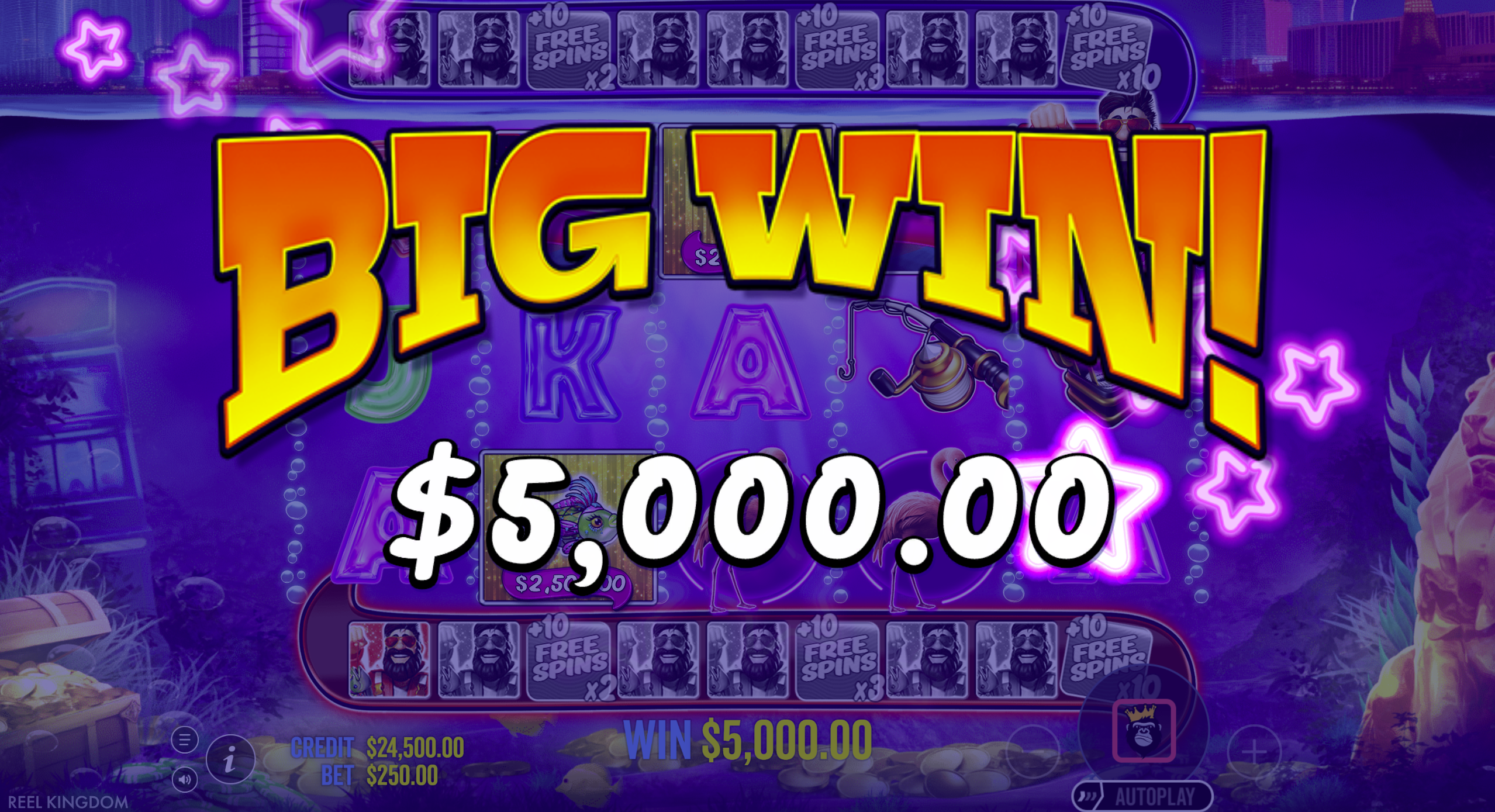 Triggering 10 free spins starts the main event. Money fish with cash values land, and the appearance of either type of fisherman wild collects them. The chance of a Double Down Wild landing adds a huge layer of anticipation and volatility to every spin, as it can instantly supercharge the entire round's payout.